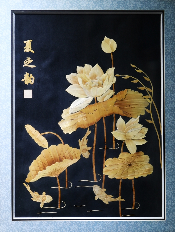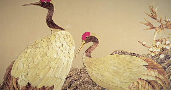 大豐麥稈剪貼畫是江蘇省非物質(zhì)文化遺產(chǎn),由精選處理過的麥稈進行制板、裁剪、燙色、粘貼而成,創(chuàng)作工藝復(fù)雜,內(nèi)容涵蓋人物、山水、花鳥魚蟲等。麥稈畫是中國獨有的民間手工藝制品,它起源于東漢,興盛于唐宋,流行于明清。麥稈最美的是它的光澤,因此制作麥稈畫首先要從選擇合適的麥稈開始。要挑揀長得直、長得粗、晾得好的,通過蒸煮高溫脫脂后,經(jīng)過處理分出“草皮”和“草心”。草皮用以制作畫面主體有光澤的部分,比如鳥類的羽毛;草心用以制作畫面背景無光澤的部分,比如山石等。這種搭配令麥稈畫擁有豐富的表現(xiàn)力,并且更加有質(zhì)感。