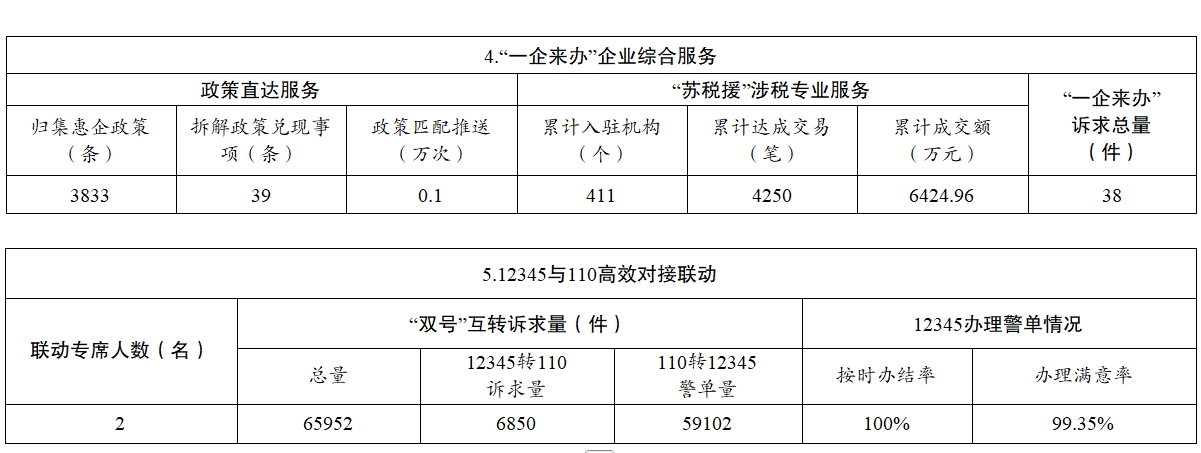 1.“一企來辦”綜合服務(wù)平臺。持續(xù)推進“一企來辦”企業(yè)綜合服務(wù)平臺建設(shè),搭建訴求服務(wù)、惠企服務(wù)等服務(wù)模塊,實現(xiàn)企業(yè)提交的政策咨詢、問題反饋、舉報投訴等問題實時收集、分流交辦,推動解決企業(yè)發(fā)展遇到的難點堵點問題。2024年3月14日正式上線“一企來辦·蘇稅援”涉稅中介服務(wù)專區(qū),已入駐涉稅機構(gòu)411戶,累計成交量4250筆,累計成交金額6424.96萬元。