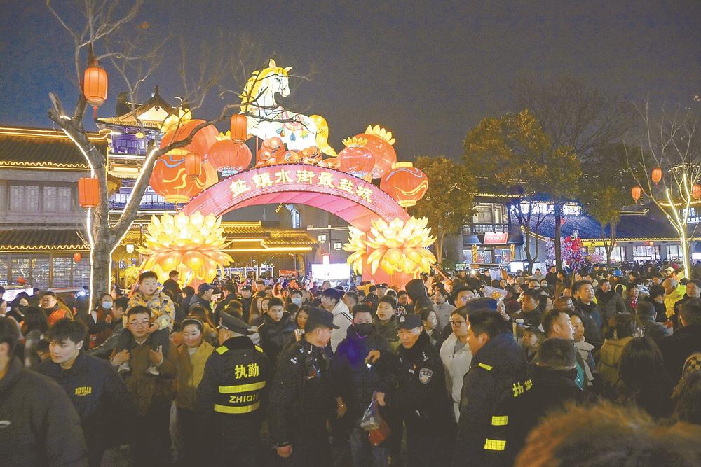 3月3日,鹽鎮(zhèn)水街現(xiàn)場(chǎng),雖然游客摩肩接踵,但秩序井然。